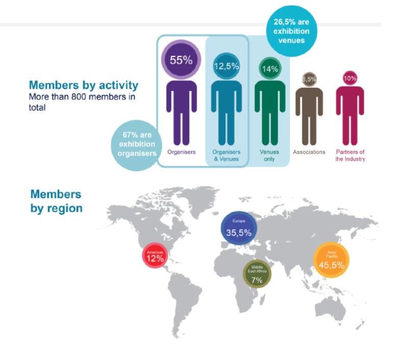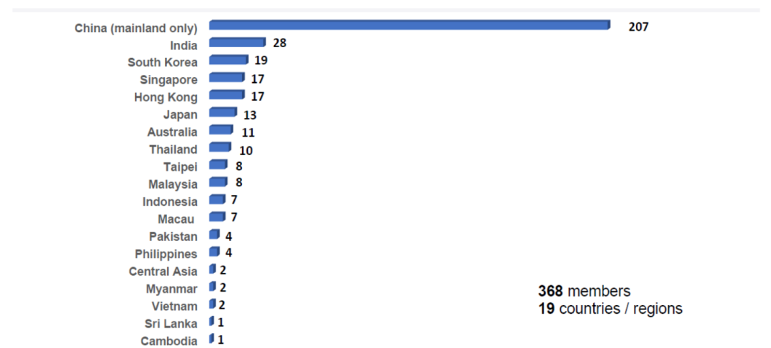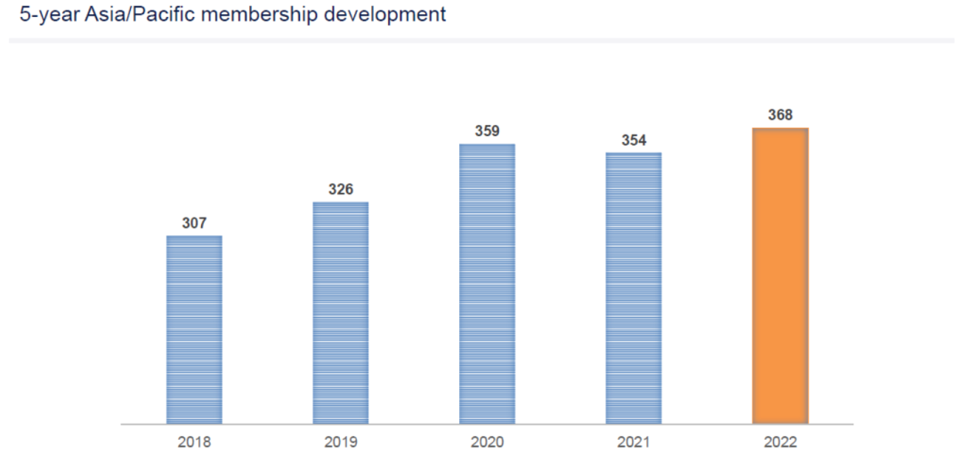 截止到2022年11月初,国际展览业协会(UFI)拥有来自82个国家或地区的808家会员。其中,亚洲会员368家,来自19个国家或地区;中国会员207家,成为全球最大会员国,其次是印度28家,韩国19家。自2018年以来,5年内亚洲地区会员持续保持增长,中国会员增速最快。