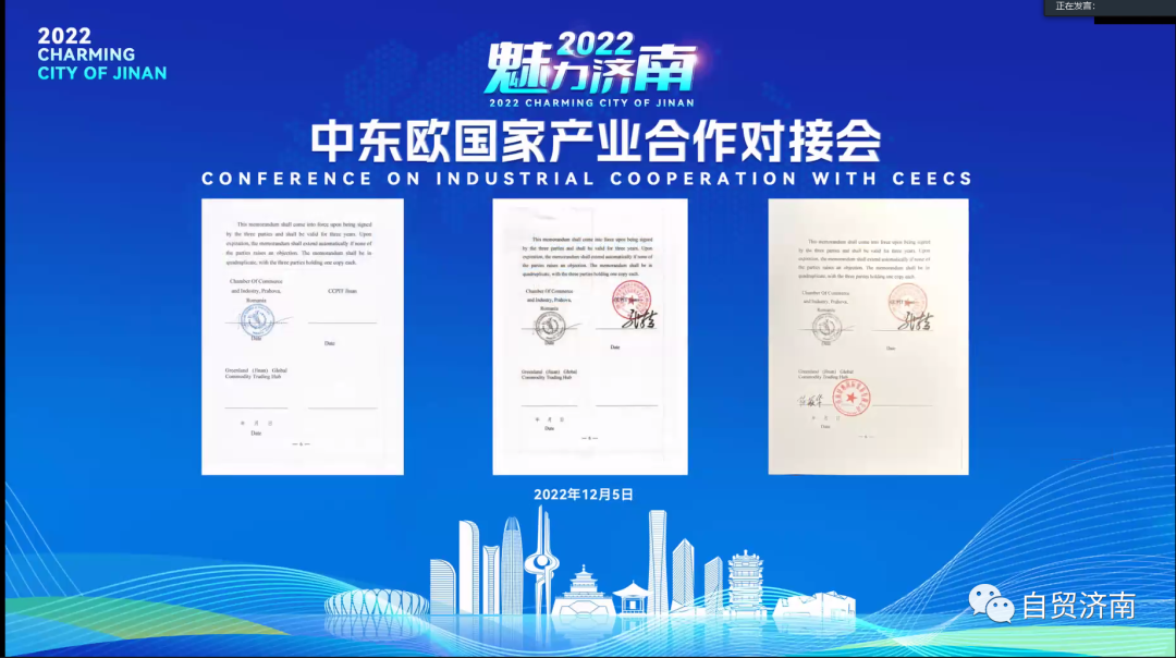 12月5日,由市贸促会、山东自贸试验区济南片区管委会共同承办的“魅力济南”-中东欧国家产业合作线上对接会成功召开。会上,作为济南片区重点项目,绿地(济南)全球商品贸易港进行了专题推介,并与罗马尼亚普拉霍瓦商会、圣彼得堡市喀琅施塔得工商会等境外商协会分别签署了合作备忘录。