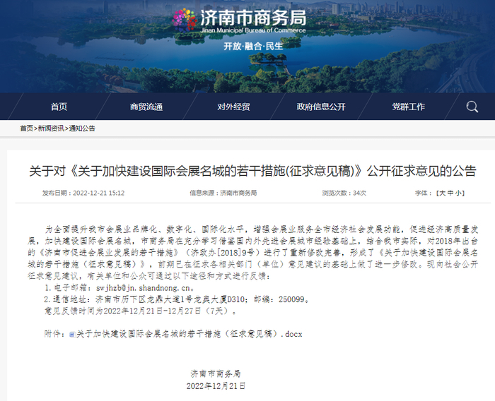 12月21日,济南市商务局发布公告,对《关于加快建设国际会展名城的若干措施(征求意见稿)》公开征求意见,旨在全面提升我市会展业品牌化、数字化、国际化水平,增强会展业服务全市经济社会发展功能,促进经济高质量发展,加快建设国际会展名城。