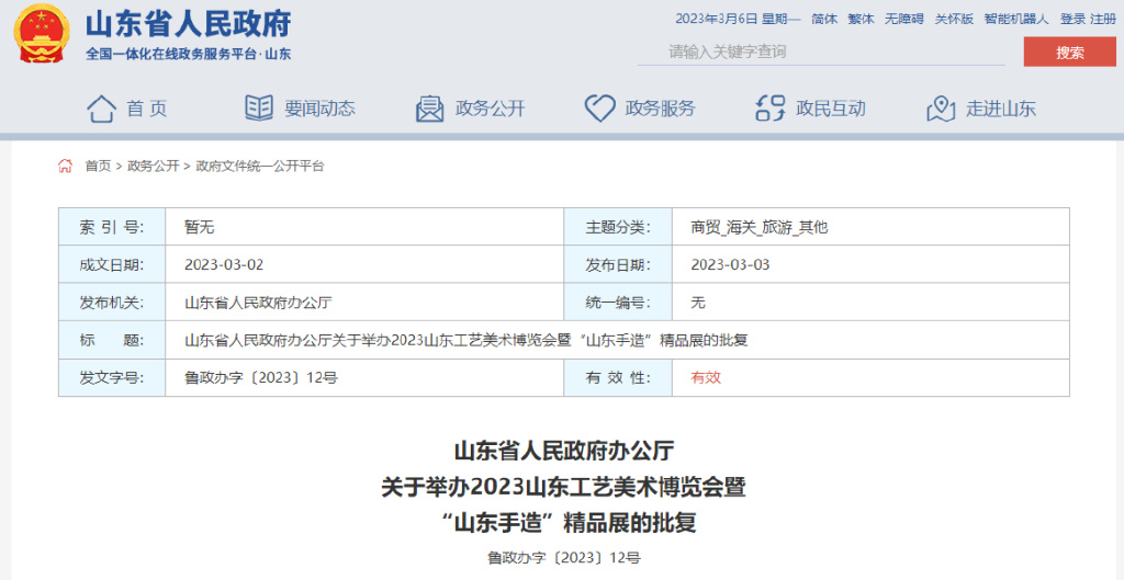 近日,山东省政府网站发布《山东省人民政府办公厅关于举办2023山东工艺美术博览会暨“山东手造”精品展的批复》——