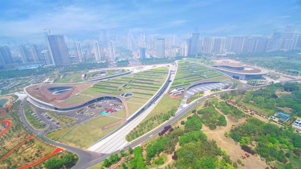 项目屋面均为斜坡种植屋面,平均坡度20°,最高可达50°,坡屋面绿化面积约10万平方米,并采用30余万平方米超大面积折线错位异形幕墙,坡屋面绿化面积与幕墙面积均为全国最大。项目建设过程中,采用14.7%大跨度倾斜重载钢结构网架整体顶升施工技术,90天完成200余万方土方开挖,200天完成全部18万平米地下结构,380天全部封顶,实现了高效建造,完美履约,并彰显建筑品质。