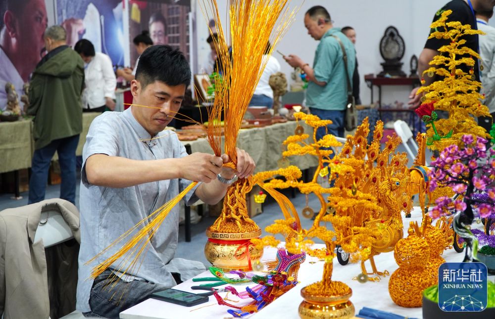 5月12日,在2023山东工艺美术博览会暨“山东手造”精品展上,非遗传承人杨光做现场展示。
