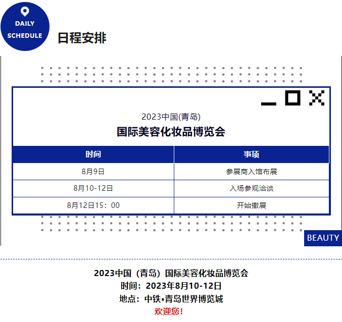 【展讯】2023中国(青岛)美容化妆品博览会将于8月10-12日在中铁·青岛世界博览城盛大开幕 2023-08-08 09:21:04 本站 网络 852 上一篇 2022年中东(迪拜)国际汽车零部件及售后服务展览会超百家中国企业亲临现场 下一篇 2023青岛国际时尚发制品博览会将于8月11日—13日在中铁·青岛世界博览城盛大举办
