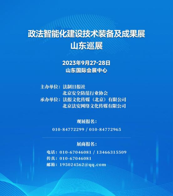 由法制日报社、北京安全防范行业协会主办,法报文化传媒(北京)有限公司、北京法安网络文化传媒有限公司承办的“政法智能化建设技术装备及成果展山东巡展”将于2023年9月27日至28日在济南山东国际会展中心举办。本次活动旨在推进现代信息技术与政法工作深度融合,搭建政法单位、科技企业经验交流、技术对接平台。