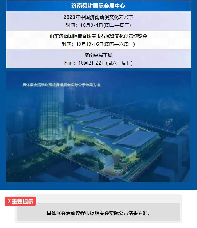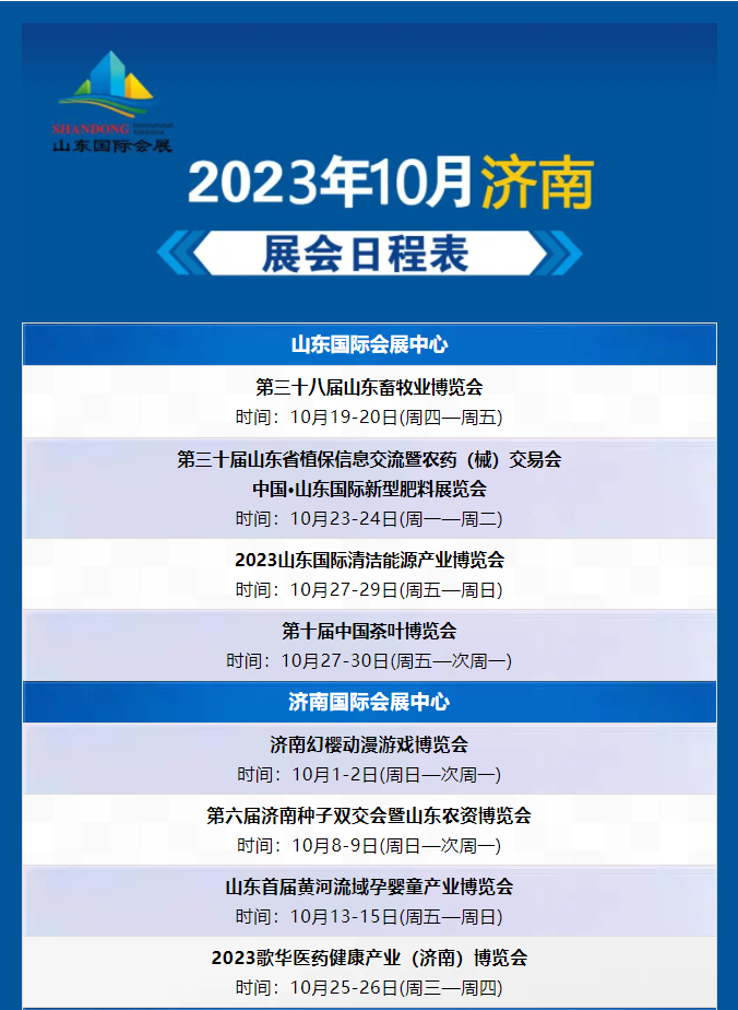 2023年10月济南展会日程表 2023-09-26 09:43:23 本站 网络 855 上一篇 2022年中东(迪拜)国际汽车零部件及售后服务展览会超百家中国企业亲临现场 下一篇 2023山东(青岛)宜居博览会、绿色城市发展大会27日启幕