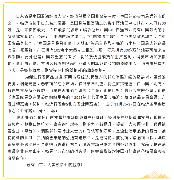 邀请函 | 2023第十七届中国(临沂)糖酒商品交易会暨北方酒业博览会11月25-27日临沂国际会展中心召开