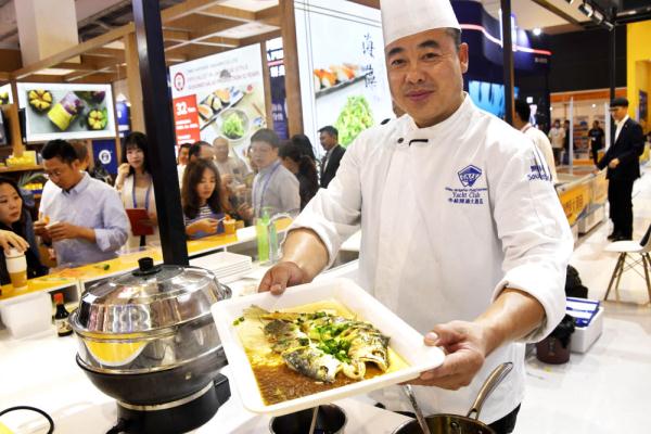 10月25日,参展企业的厨师在渔业博览会上加工水产品。