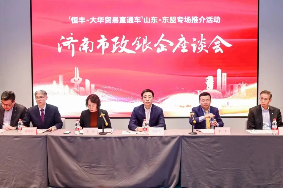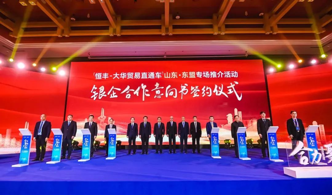 12月12日,恒丰银行联合新加坡大华银行在山东济南举办“恒丰-大华贸易直通车”之山东·东盟专场推介会,举行恒丰大华山港助力山东东盟经贸首航仪式,现场与12家单位签订合作意向书。山东省副省长、省政府秘书长宋军继出席活动并致辞,省政府办公厅副主任刘太广,山东省商务厅厅长陈飞,山东省港口集团党委书记、董事长霍高原,大华银行中国行长兼首席执行官符懋赞,恒丰银行党委书记、董事长辛树人出席活动。