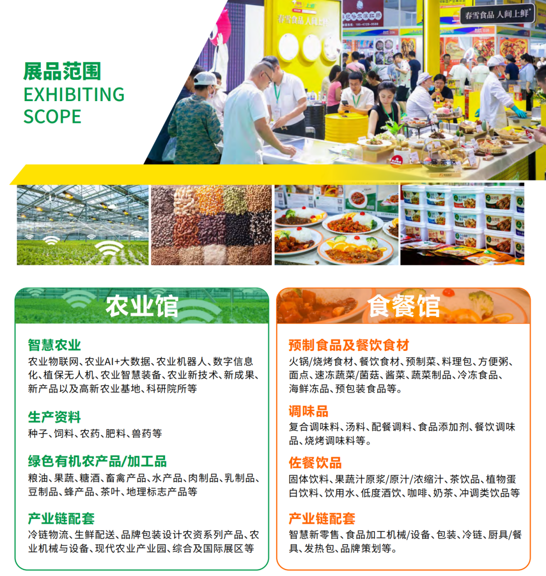博览会设置智慧农业、绿色有机农产品/加工品、生产资料、餐饮食材、火锅烧烤供应链、调味品、佐餐饮品等多个主题展区。汇聚国内农业品牌企业、上下游产业链优质企业、餐饮食材优秀企业等,并定向邀约来自全国各地经销代理、酒店餐饮、生产加工、团餐企业、商超电商平台等代表汇聚济南,共同搭建一个面向全行业的品牌建设、推广和交流的服务平台。