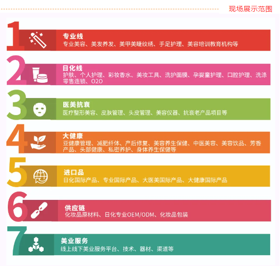 展示范围涵盖专业美容、美甲、美睫、纹绣、护肤、个人护理、彩妆、洗护用品、皮肤管理、产后修复、大健康、医疗美容、原材料、OEM\ODM、包材、进口商品等深度链接上中下游产业链资源,为大家提供一个高效对接商贸平台。
