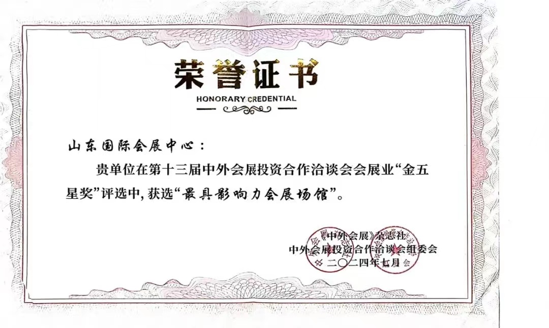 7月9日-11日,由中外会展杂志社主办的第十三届中外会展投资合作洽谈会在北京举办,在会上的“会展业金五星奖”评选中,山东国际会展中心荣膺“2023—2024年度最具影响力会展场馆”荣誉称号。