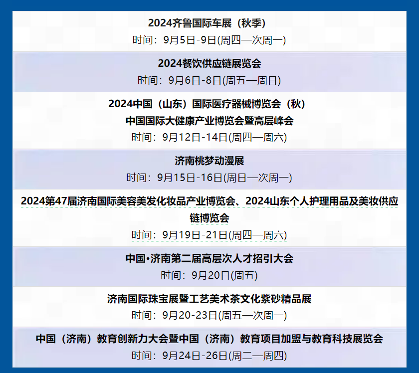 2024年9月山东国际会展中心展会日程表 2024-08-27 09:16:30 本站 网络 572 上一篇 2022年中东(迪拜)国际汽车零部件及售后服务展览会超百家中国企业亲临现场 下一篇 【展会资讯】临沂国际会展中心9月份展会排期