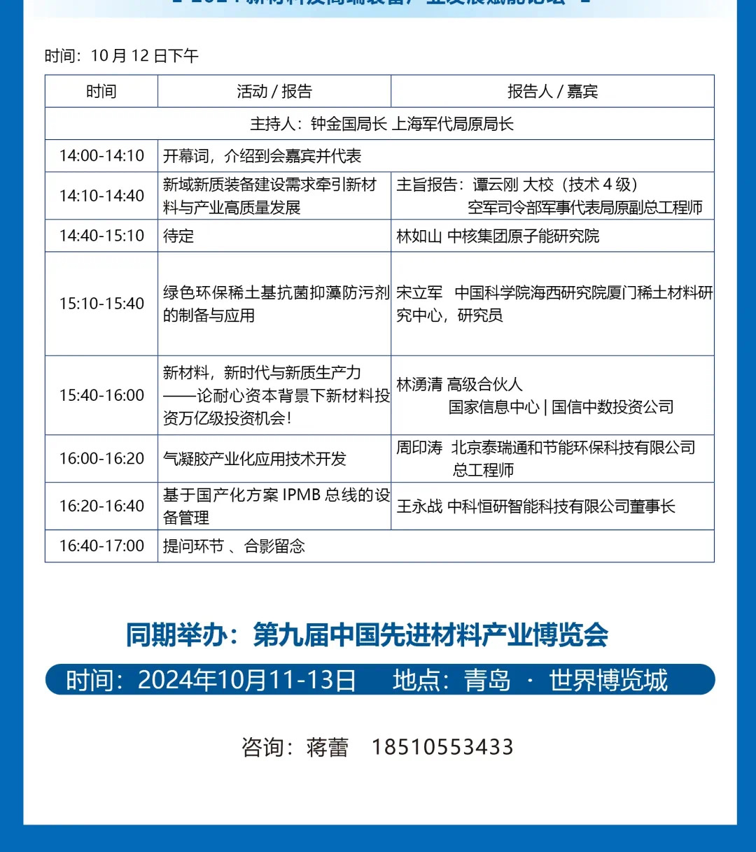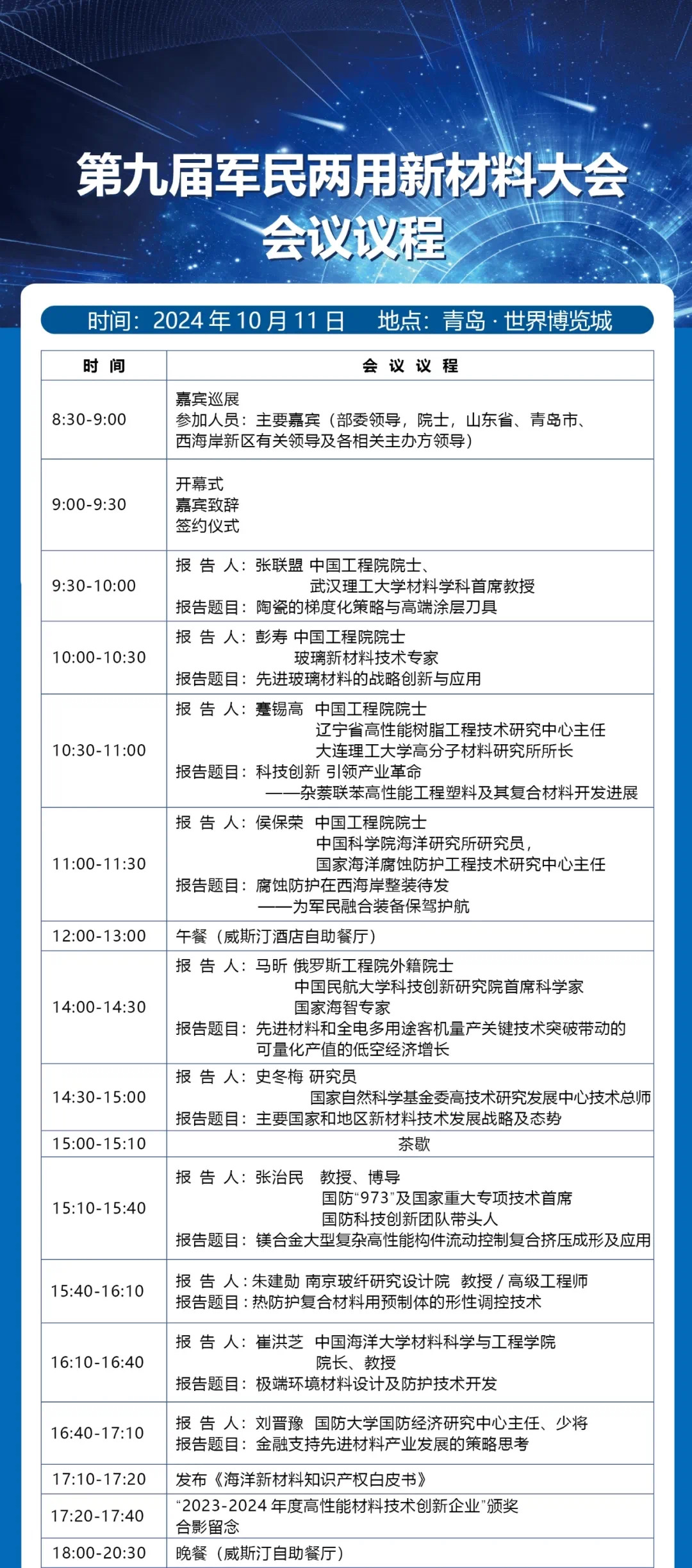 【展讯】最新 2024第九届军民两用新材料大会——会议议程 2024-10-08 09:19:09 本站 网络 1050 上一篇 2022年中东(迪拜)国际汽车零部件及售后服务展览会超百家中国企业亲临现场 下一篇 临沂糖酒快报 | 2024山东秋季临沂糖酒会展位已售80%;贵州推动白酒企业转型升级;季克良著作出版