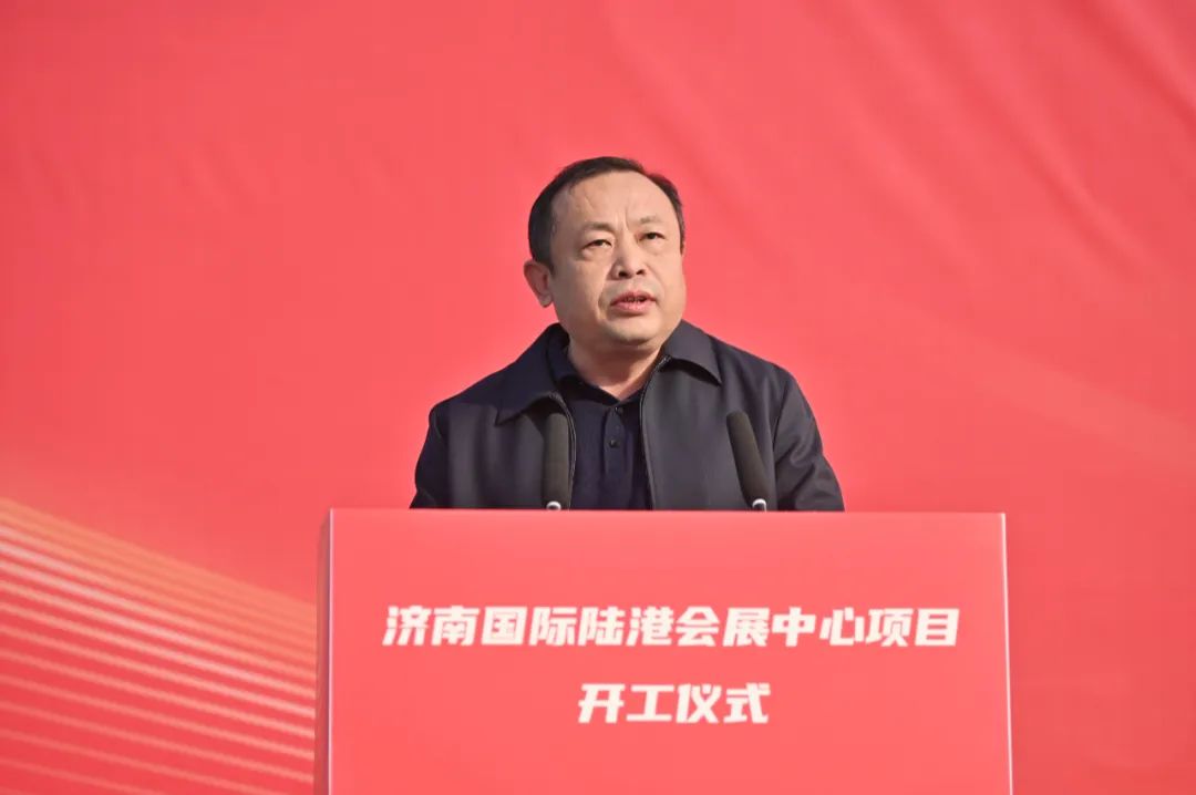 ▲济南临港经济开发区党工委副书记、管委会主任孟祥民宣布济南国际陆港会展中心项目开工。