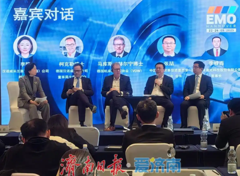 会中,马库斯·赫尔宁博士、柯克勒博士分别介绍了2025EMO展会情况和主办方情况。会议组织了一场精彩的对话讨论和现场问答。马库斯·赫尔宁博士、柯克勒博士、济南市贸促会会长张喆、济南森峰激光科技股份有限公司董事长李峰西就主持人和记者的提问分享了各自独到见解和宝贵建议。