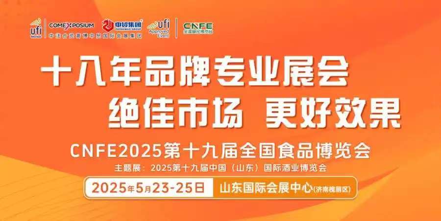 CNFE第十九届全国食品博览会将于5月23-25日在济南市山东国际会展中心盛大举办。【主题展:第十九届中国(山东)国际酒业博览会,同期展:ACE2025第三届亚洲餐饮展览会】