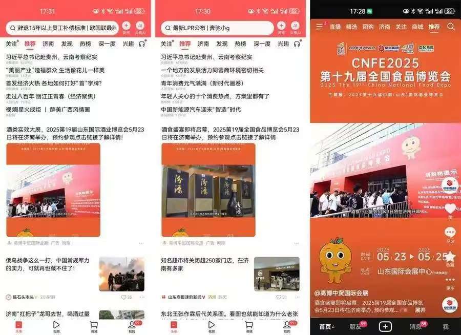 为此,全国食品博览会一方面联动媒体加大百度、微信平台的信息曝光力度,对展会新闻进行广泛传播;另一方面,大会组委会正针对抖音、今日头条平台进行精准广告投放,实现海量曝光,切实提升展会专业观众组织能力的进一步提升。