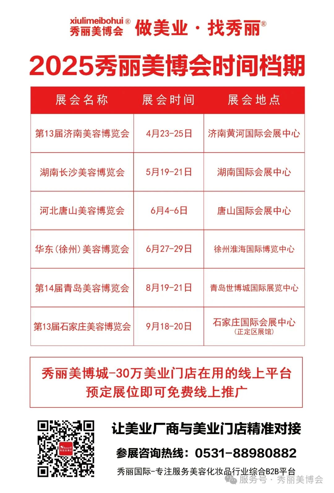 2025第13届济南国际美容化妆品行业博览会由山东秀丽国际展览有限公司主办,山东省化妆品行业协会、山东省美发美容行业协会、美容院线专委会支持,立足于“泉城”-济南,辐射华北地区的一场行业大会,成为美业人找寻优质品项,探索2025年行业趋势的最佳渠道。第13届济南国际美容行业博览会将为您带来更多精彩,带来美妆行业新的突破与创新、商机与趋势!为大家呈现一场美业盛会!